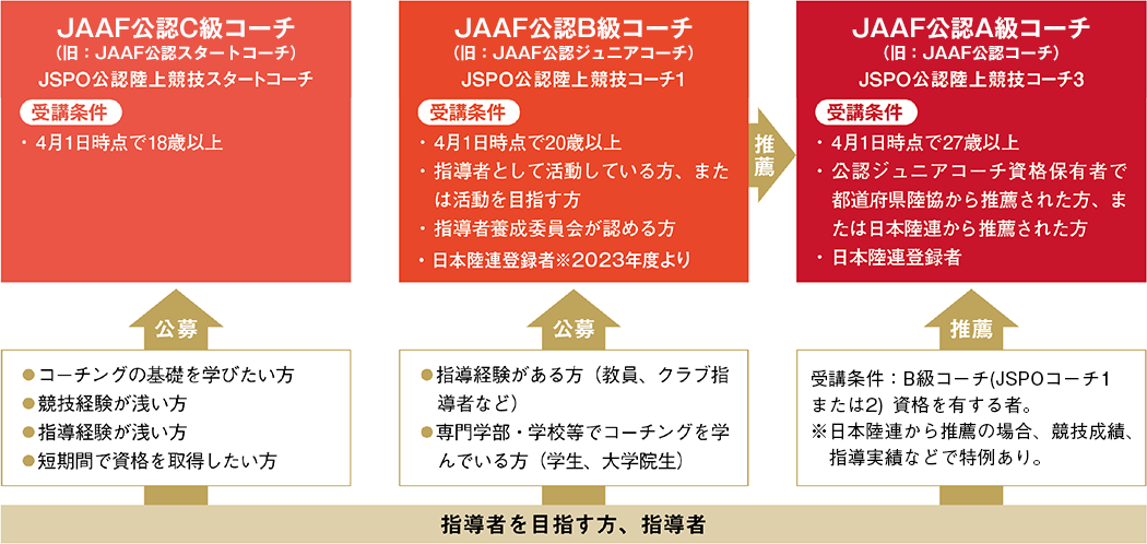 本連盟(以下JAAF)では、「JAAF公認A級コーチ」「JAAF公認B級コーチ」「JAAF公認C級コーチ」3種類の資格名を設定し、陸上の指導現場に立つすべての指導者がコーチ資格を取得し、安心・安全な活動環境となることを目指しています。