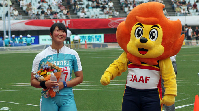 女子砲丸投決勝で優勝した郡菜々佳(九州共立大)が、声援に…
