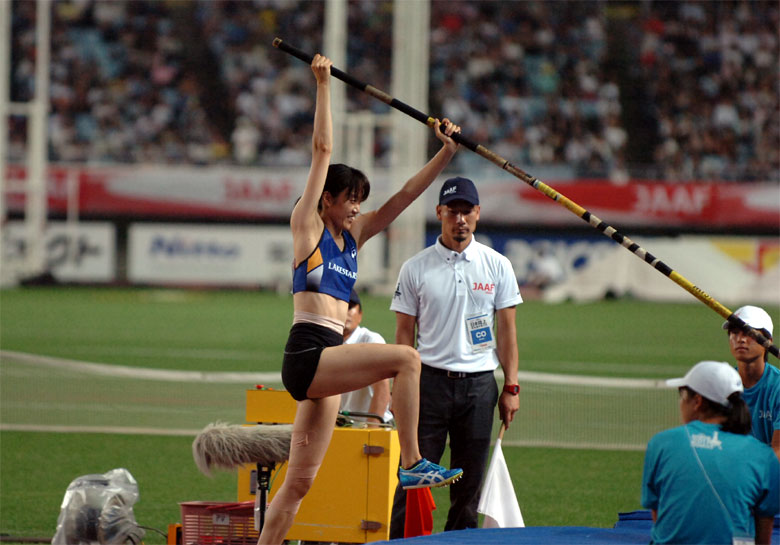 女子棒高跳は4m20を跳んだ我孫子智美と中田愛の対決となったが、4m30を最後にクリアした我孫子智美が優勝した。