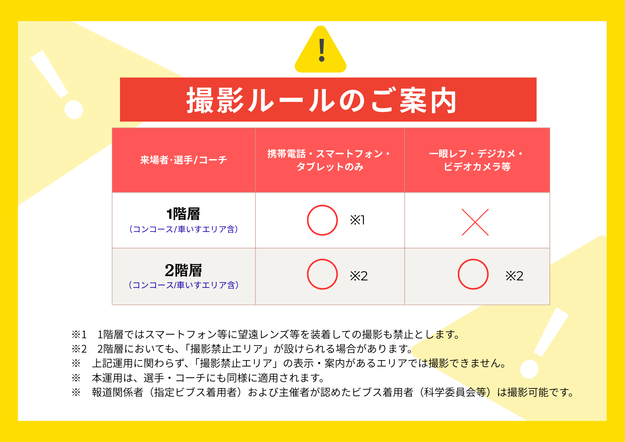 - 会場内で撮影された映像(静止画を含む)は、報道等を目的とした各種番組や競技場内の大型映像装置、本連盟のソーシャルメディア(公式WEBサイト・SNS)等に使用される場合があります。
