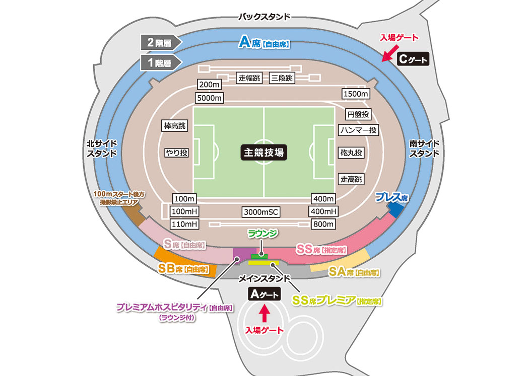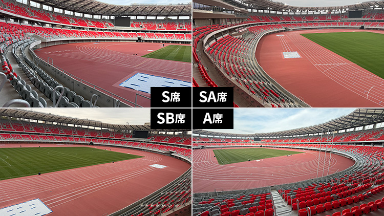 - ✅ メインスタンド中央上段から、トラック・フィールド競技全体を見渡せる観戦席