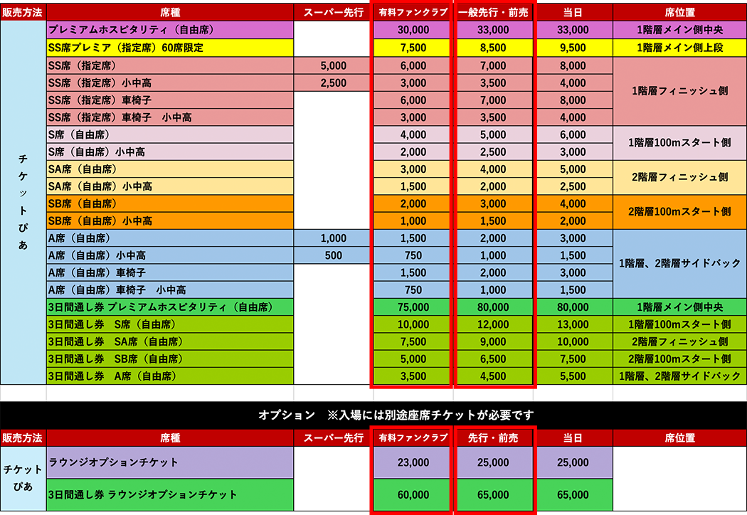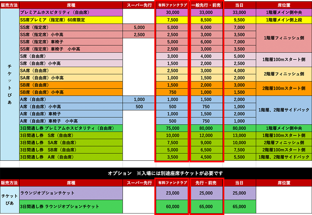 席種 RIKUJOファンクラブ(有料会員) 一般前売 3日間通し券 プレミアムホスピタリティ 75,000円 80,000円 3日間通し券 S席 10,000円 12,000円 3日間通し券 SA席 7,500円 9,000円 3日間通し券 SB席 5,000円 6,500円 3日間通し券 A席 3,500円 4,500円 価格