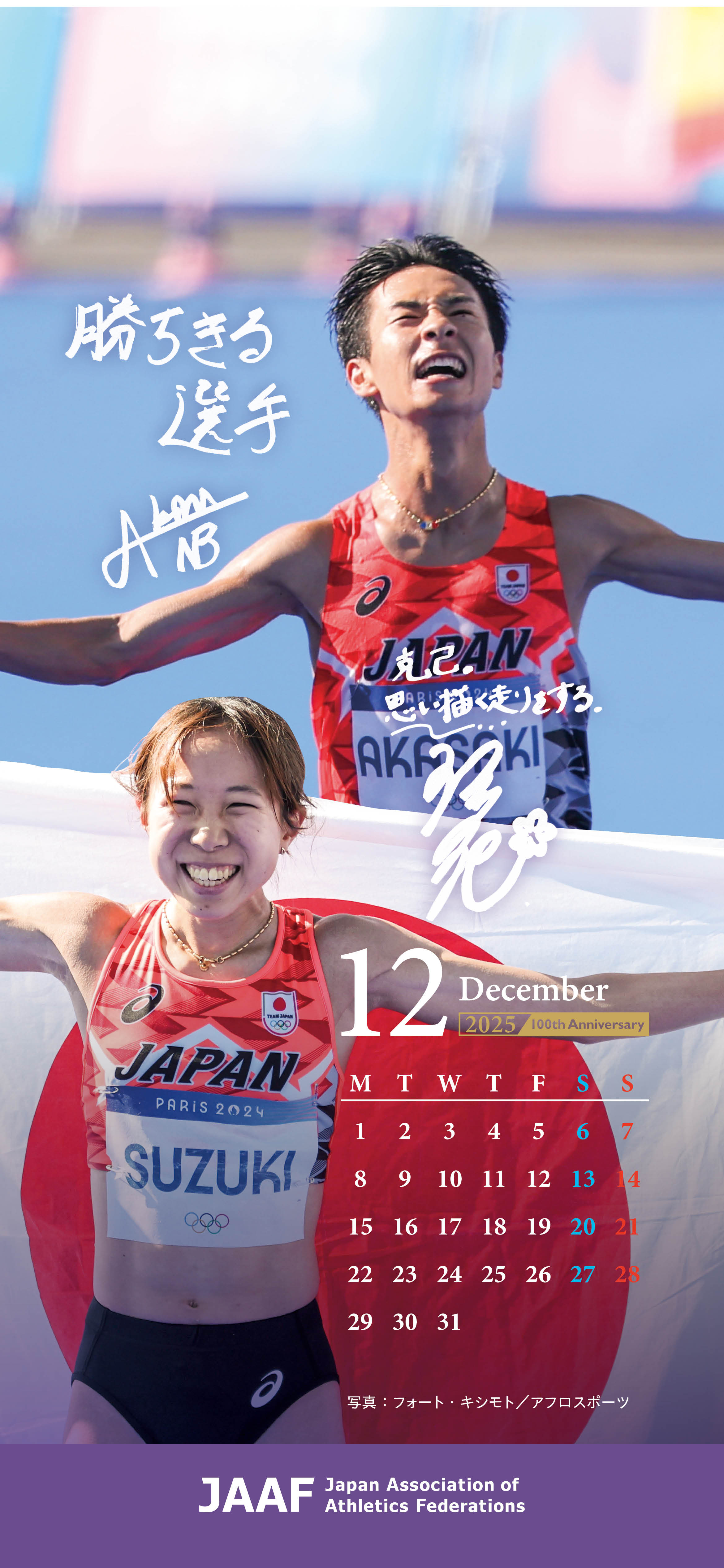 12月のカレンダーには2024年8月に開催された「パリ2024オリンピック競技大会」男子マラソン6位入賞の赤﨑暁(クラフティア)、女子マラソン6位入賞の鈴木優花(第一生命グループ)の2名が登場!