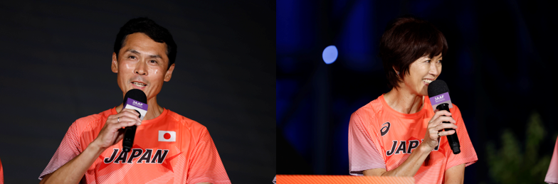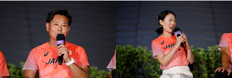 1991年大会には、弱冠20歳でシニア初代表として男子400mハードルに出場。今大会ではチームリーダー(監督)として日本選手団を率いる山崎一彦さん(日本陸連強化委員長)は、日本代表ユニフォームカラーに染まった東京スカイツリーの感想を求められ、「国立競技場を、このサンライズレッドで染めたいなと思った。満員となったスタジアムのなかで、選手たちがこのユニフォームでバンバン競技する姿を見られるんじゃないかなと思う」と力強くコメント。また、当時高校3年生で女子4×400mリレーに出場した徳田由美子さんは、鮮やかなライティングの感想を問われて、「美しいなと思って見入ってしまい、“美しさって、人の心を魅了するのだな”と思った。(東京世界選手権での)選手たちの美しい眼差しや美しいパフォーマンスを見られることが、とても楽しみになった」と、柔らかな表情で話しました。