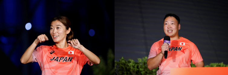 続いて、岡田選手と新保選手の2人が登壇しました。岡田選手は、11月に初めて東京で開催される東京2025デフリンピックの陸上日本代表として、女子800m・1500m・4×400mリレーの3種目に出場。また、新保選手は、世界選手権閉幕直後の9月27日からニューデリーで開催されるニューデリー2025世界パラ陸上選手権に、F37クラス男子円盤投で出場することになっています。