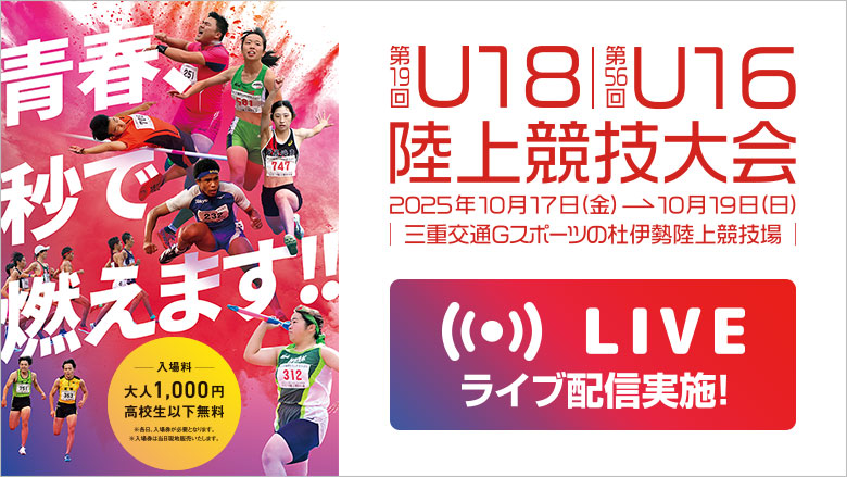 大会名 :第19回U18/第56回U16陸上競技大会開催日程:2025年10月17日(金)~19日(日)