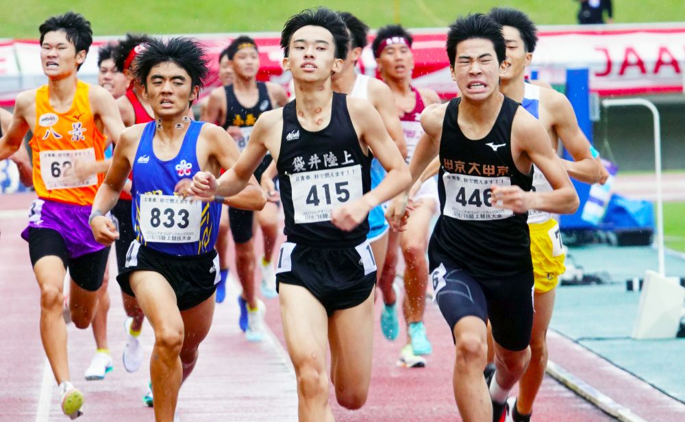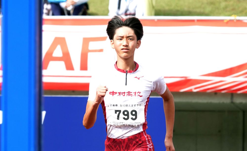 男子150mは、柳斗真(河南中3島根)と岩野喜一(大津中3神奈川)が15秒86(-0.5)の同タイムでフィニッシュし、1000分の1秒差までの判定で柳が優勝を飾りました。柳は予選で15秒57(+1.4)の大会新記録を樹立しています。1000m 中島壮琉(袋井陸上・中3静岡)2分28秒34