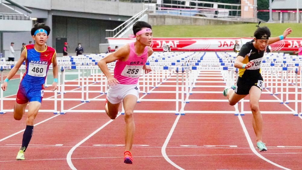 トラックの最終種目として行われた男子110mハードルは、淺内湧一朗(日大豊山高1東京)が、全中チャンピオンの合志侑乃輔(陸上アカデミー・中3京都)を0.01秒差で抑えて、全国大会初優勝。スタートで少し出遅れも、鋭いハードリングで逆転しました。走高跳 西内尊(中村高1高知)2m02