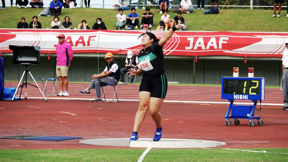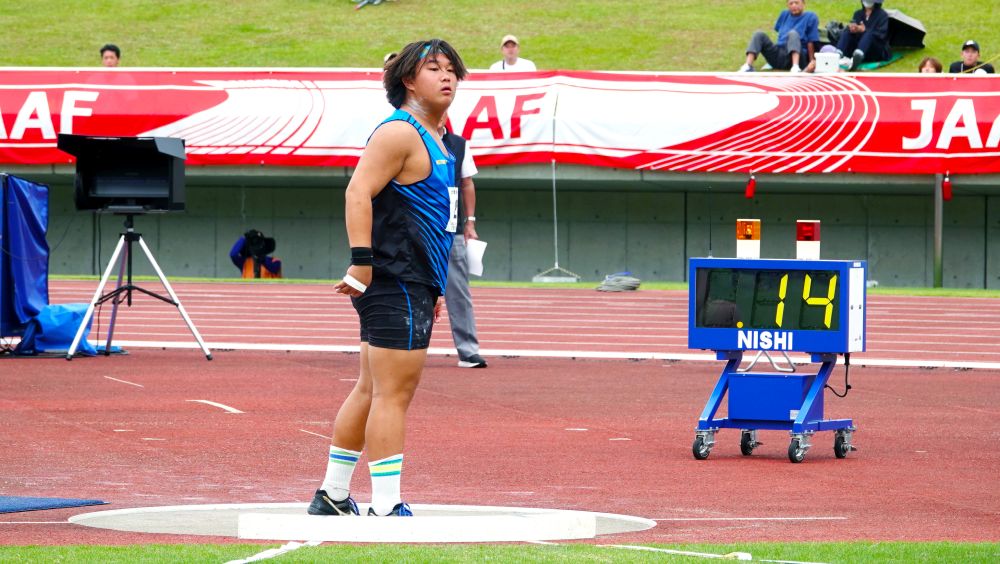 上位2位までを高校生が占めた男子砲丸投は、内藤源二(松が谷高1東京)が16m19で優勝。藤森駿介(敬徳高1佐賀)が16m15で2位に入りました。3位は中学生の藤沼兆志(美田中3栃木)が15m57を投げてメダルを獲得しました。円盤投(1.500kg)大谷勇翔(大塚高1大阪)49m38=大会新