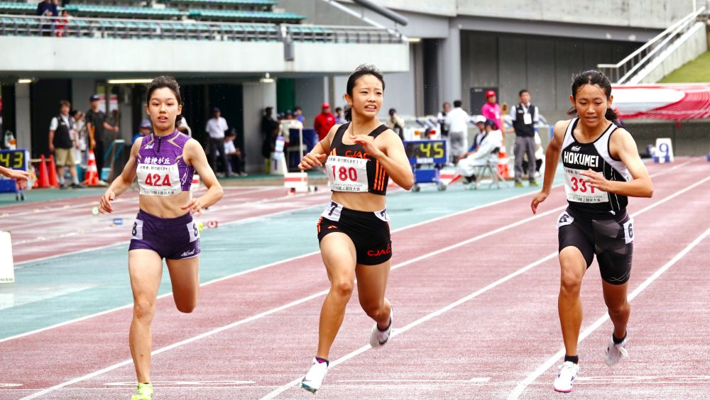 女子100mは、岡嶋莉子(CJAC・中3千葉)がただ1人11秒台となる11秒98(-0.1)で沖縄全中に続く優勝を飾りました。フィニッシュ手前で追い込んだ大喜多胡乃(豊中十一中3大阪)が12秒01で2位となり、酒井菜夏(北鳴中3石川)が12秒07で3位に食い込みました。150m 山田奈央(千葉御滝中3千葉)18秒18(-0.3)