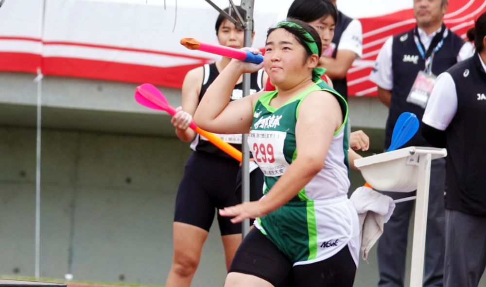 男子ジャベリックスローは、牧野賢介(津山東中3岡山)が6投目に71m26と大きく記録を伸ばして優勝しました。すべての投てきで65mを超える安定した投げが光りました。佐藤晴大(常盤中3長野)が68m46で2位。前回2位のベイカー慈韻(宮古花輪中3岩手)は68m16の3位でした。●女子