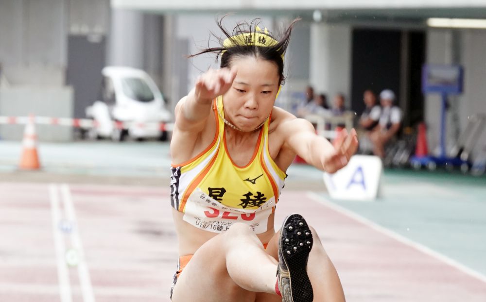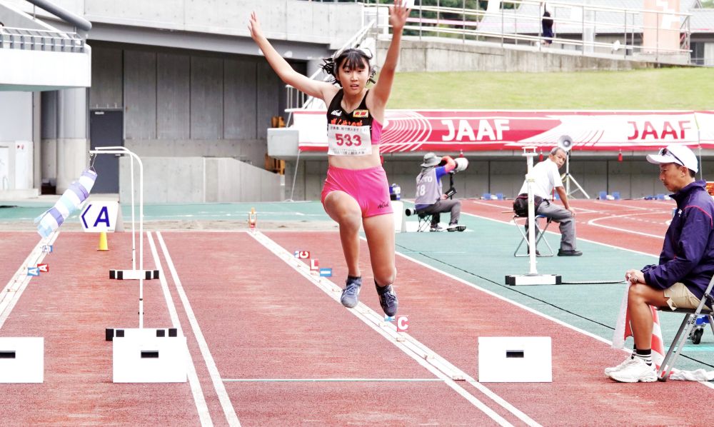 女子走幅跳は、前回、前々回と2位だった藤本茉優(星稜高1石川)が念願の優勝。1回目の5m49(-0.8)から徐々に記録を伸ばし、5回目に5m73(-0.9)で優勝を決めました。中学2年生の間遥花(社中2福井)が5m63(-0.4)と躍進し、岩橋彩吹(エクスプローマン・中3神奈川)が5m60(-0.2)で3位に入りました。三段跳 小柄由依菜(咲くやこの花中3大阪)12m00(+1.9)