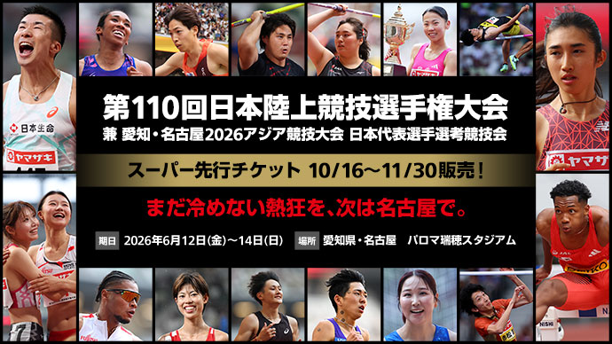 2026年6月12日(金)~14日(日)、名古屋市・パロマ瑞穂スタジアムにて「第110回日本陸上競技選手権大会」を開催することが決定いたしました。その第一歩として、10月16日(木)より数量限定で、第110回日本選手権の「スーパー先行チケット」の販売を開始しております。