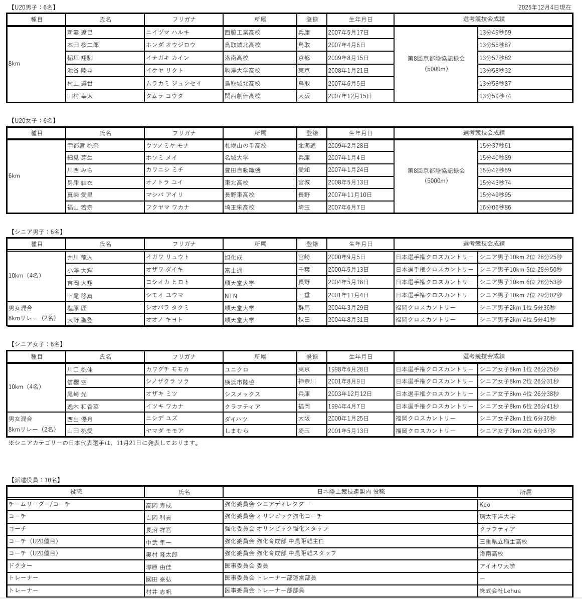 U20男子8kmには、7月のインターハイおよび滋賀国民スポーツ大会少年A・5000mで優勝した新妻遼己(西脇工業高校)、第41回U20日本選手権にて3000m・5000mの2冠を達成した本田桜二郎(鳥取城北高校)、滋賀国民スポーツ大会少年B・3000m優勝の稲垣翔馴(洛南高校)、U20女子6kmには、第41回U20日本選手権3000m優勝の宇都宮桃奈(札幌山の手高校)、ワールドユニバーシティゲームズ10000m 4位の細見芽生(名城大学)など、男女計12名を日本代表選手として派遣いたします。