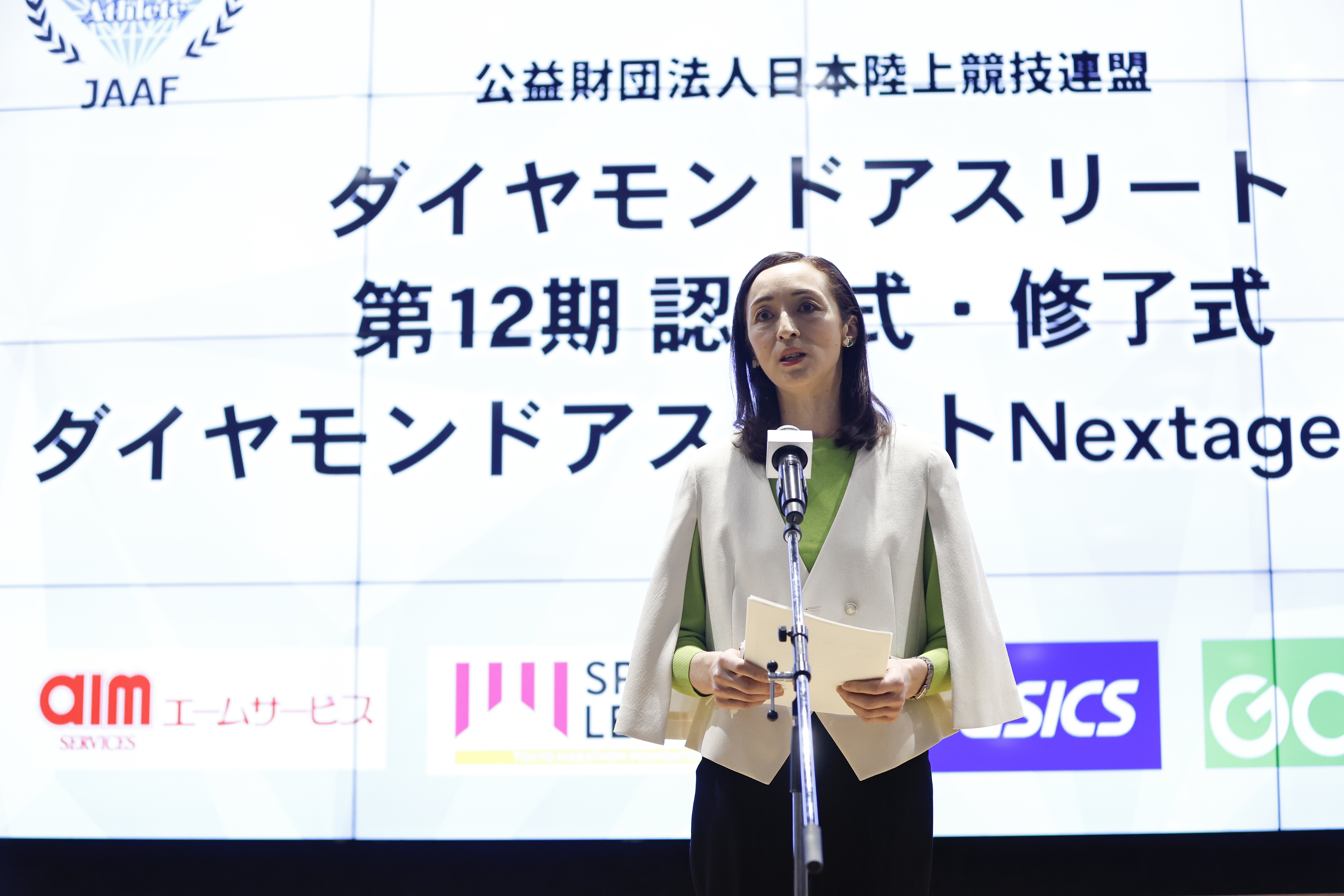続いて、第12期ダイヤモンドアスリート/ダイヤモンドアスリートNextageをサポートくださる4企業・団体が、室伏マネジャーより紹介されました。一般社団法人東京マラソン財団は、実施される研修や海外遠征などプログラム全体のサポートのほか、同財団主催の大会やイベントへの参加を通じて社会貢献活動の貢献を経験させていただいています。アシックスジャパン株式会社は、ダイヤモンドアスリート、ダイヤモンドアスリート Nextageが活動する際の公式ウエアやシューズをサポート。12期生たちには、シックなオリーブグリーンのウエアが提供されています。栄養面のサポートにあたるエームサービス株式会社は、調理実習を含む研修のほか、面談や食事調査など1年を通して選手の日々の食事やコンディション管理に貢献。また、株式会社GABAからの英会話レッスンのサポートは、認定アスリートたちの海外への遠征や大学の進学に不可欠な、大きな後押しとなっています。