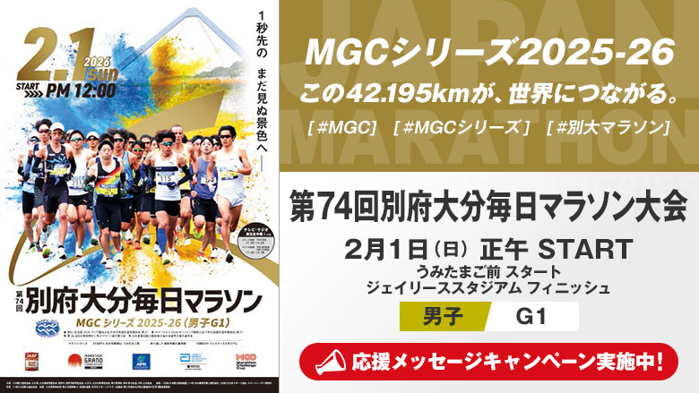 マラソン年間王者決定戦「マラソングランドチャンピオン(MGC)シリーズ2025-26」のグレード1(G1)レース「第74回別府大分毎日マラソン」が2月1日(日)、大分市内のジェイリーススタジアムをフィニッシュ地点とする別府大分毎日マラソン大会コースで開催される。