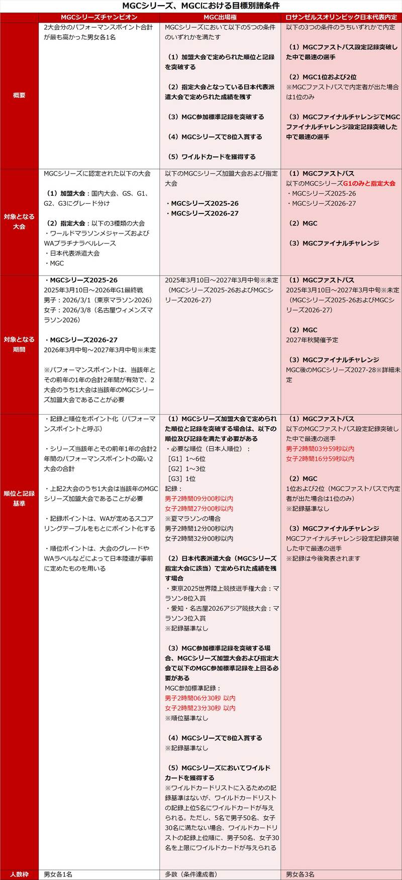 MGCチャンピオン、MGC出場権獲得、ロサンゼルスオリンピック日本代表内定のために必要な期間や大会、タイムなどの条件は、それぞれ異なります。以下に目標別に概要をまとめました。