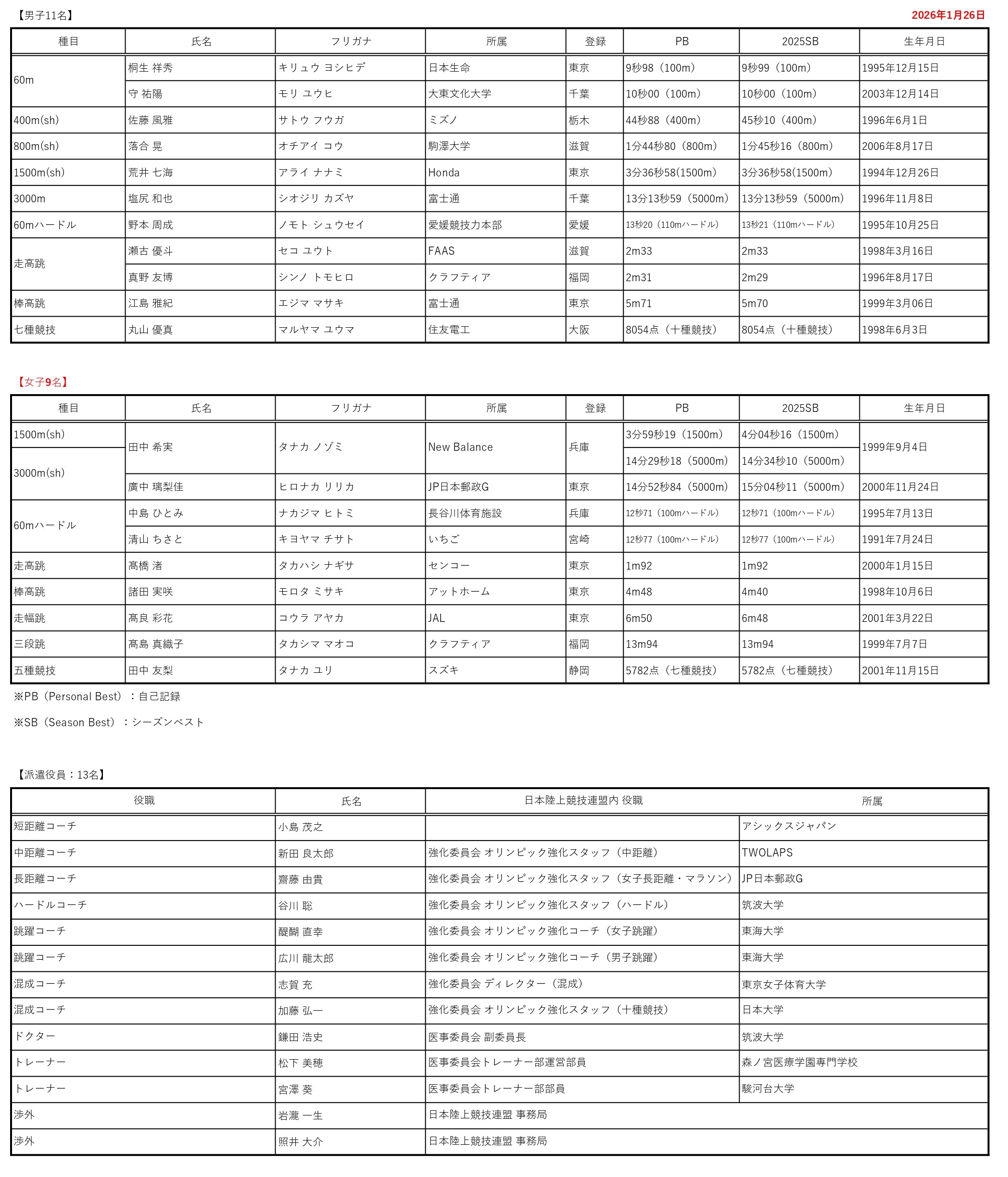 2026年2月6日(金)~2月8日(日)に天津(中国)で開催される「天津2026アジア室内陸上競技選手権大会」におきまして、日本代表に決定しておりました久保凛(東大阪大敬愛高校)が出場を辞退することになりましたのでお知らせいたします。