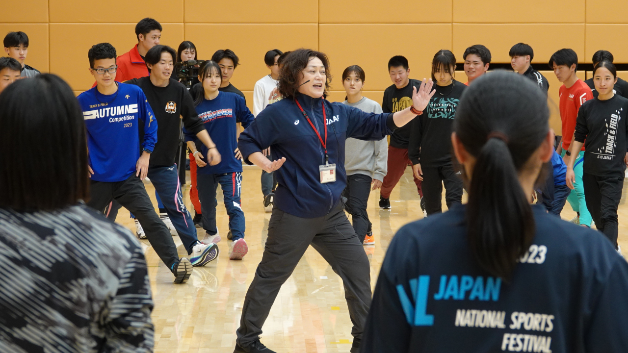 この研修合宿では、「トランスファートレーニング」が取り入れられています。これは、育成年代からシニア年代へと競技を続けていくなかで種目の変更(トランスファー)がスムーズにできる状況にしておくことのほか、育成年代に重要とされている、「さまざまな動きを経験していくなかで、身体能力を全体的にバランスよく高めていくこと」を期して、参加する選手たちがブロックの垣根を越えて、全員で、各種目の基礎トレーニングに取り組んでいくものです。今回の合宿でも、短距離・ハードル、跳躍、投てき、競歩のトランスファートレーニングが日程に盛り込まれ、2日目の午前には、競歩のトランスファートレーニングが行われました。指導に当たったのは、強化育成部で競歩を担当する塚田美和子氏と石田大介氏の2人。最初に「今日やる内容は、皆さんの種目の練習のなかで、あるいは動きのなかで生かしてもらえたらというのが一番の思い。“競歩を覚える”というよりは、“競歩の動きを自分たちの種目のなかに生かす”という考え方で取り組んでもらいたい」と話した塚田氏が、競歩のイメージやルールを簡単に説明したうえで、「骨盤まわりを大きく動かして、身体を前方へ移動させていく競技」であると説明しました。さらに、「競歩以外の種目でも、“もっと骨盤を動かそう”と指導されることがあるはず。今日のトランスファートレーニングでは、どうやれば骨盤を動かしていけるのかに取り組んでみよう」と述べ、ウォーミングアップとして、仰臥や長座、そして立位の状態で、骨盤を動かしていくことからスタートしました。そこから歩行へと移っていくなかで、選手たちは、骨盤をどのようなイメージで動かすと、うまく前進できるのか、1歩の歩幅を大きくすることができるのかなどの感覚を理解しました。
