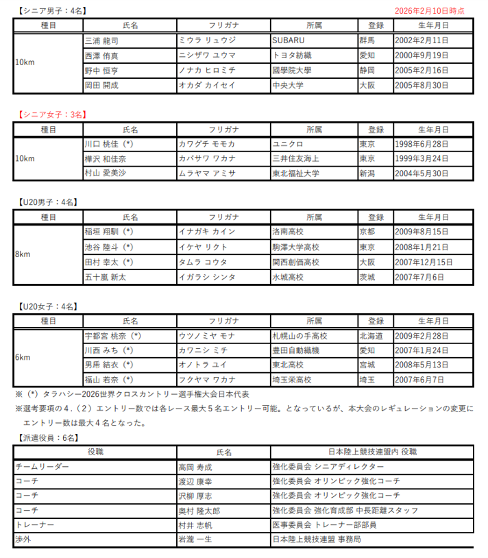 2026 年 2 月 21 日(土)に福岡市・海の中道海浜公園で開催される「アジアクロスカントリー選手権大会 福岡 2026」におきまして、日本代表に決定しておりました廣中 璃梨佳(JP日本郵政G)が出場を辞退することになりましたのでお知らせいたします。