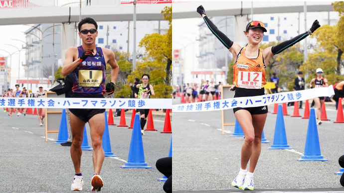 今年からワールドアスレティックス(以下、WA)主催の国際大会実施種目が、従来の20kmから21.0975km(ハーフマラソン)へと変更することにあわせて、本大会も今年からハーフマラソン競歩で実施されることに。上位4名がWAの設定する世界記録基準(1時間21分30秒)を上回るハイレベルな戦いとなった男子は、前回20kmの世界記録を樹立した山西利和選手(愛知製鋼)が連覇し、ハーフマラソン競歩でも世界記録保持者となりました。また、女子では、梅野倖子選手(LOCOK)が昨年の35kmに続き、ハーフマラソン競歩でも日本選手権タイトルを獲得。両選手は、アジア大会代表に内定しました。このほか、併催された第38回U20選抜競歩大会女子10km競歩では、内山由菜選手(本庄東高・埼玉)が44分46秒で優勝。同種目のU20日本記録が32年ぶりに塗り替えられました。