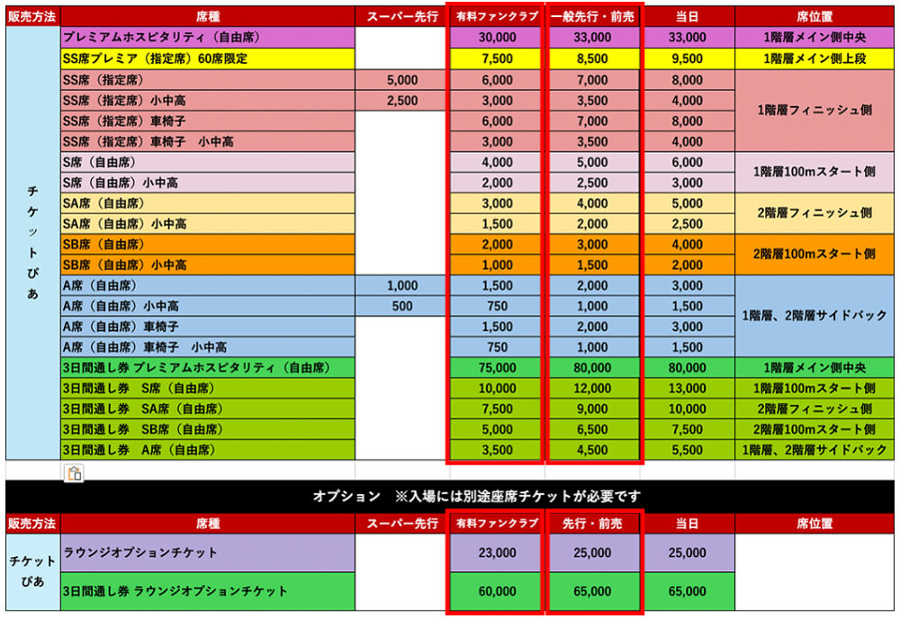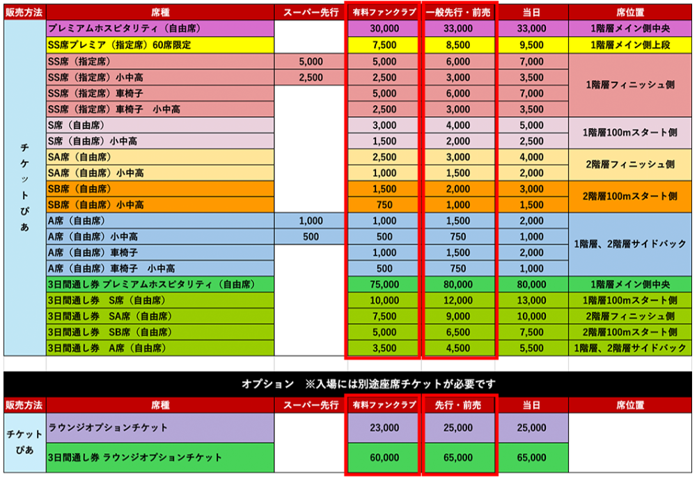 ※プレミアムホスピタリティ、SS席プレミア、SS席、S席、SA席、SB席の購入でA席での観戦が可能です。