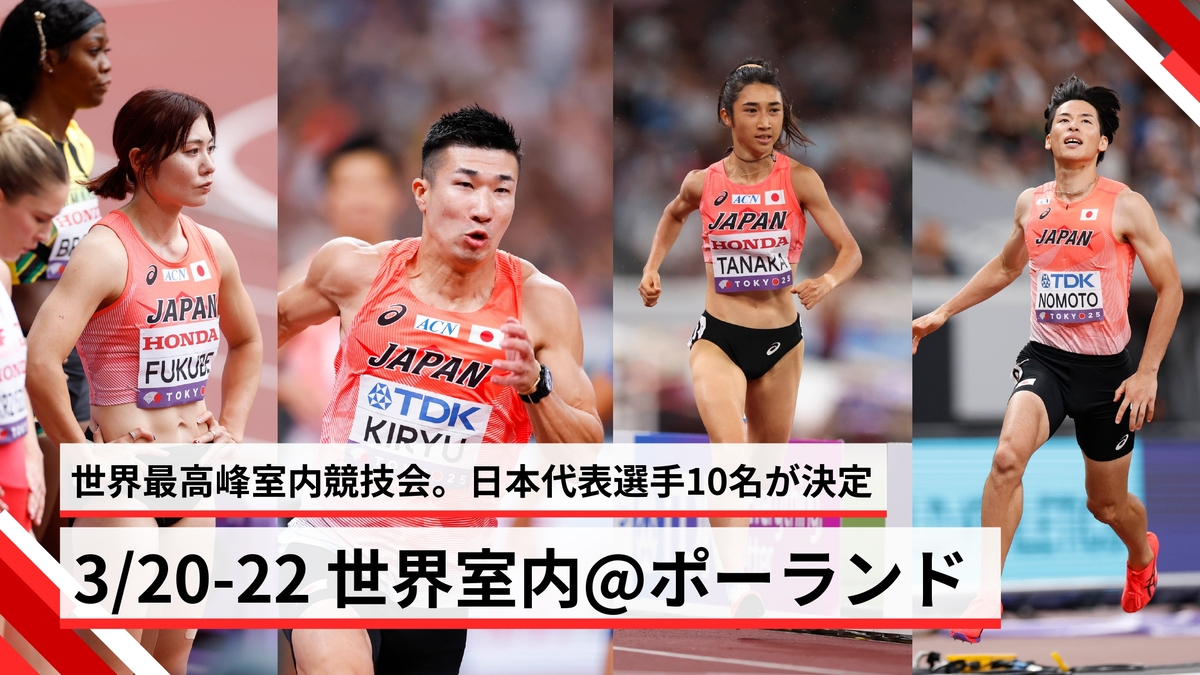 東京2025世界陸上4×100mリレーで6位入賞を果たした桐生祥秀(日本生命)は60mにエントリー。本年2月6日~8日に天津・中国で開催された天津2026アジア室内陸上競技選手権大会において、1500mで金メダル、3000mで銀メダルを獲得した田中希実(New Balance)は3000mに出場します。同アジア室内で銀メダルを獲得した野本周成(愛媛競技力本部)は60mハードルに、同じく銀メダルを獲得した真野友博(クラフティア)は走高跳に出場。合計10名の日本代表選手たちが、更なる記録更新を目指して世界最高峰の舞台に挑みます。