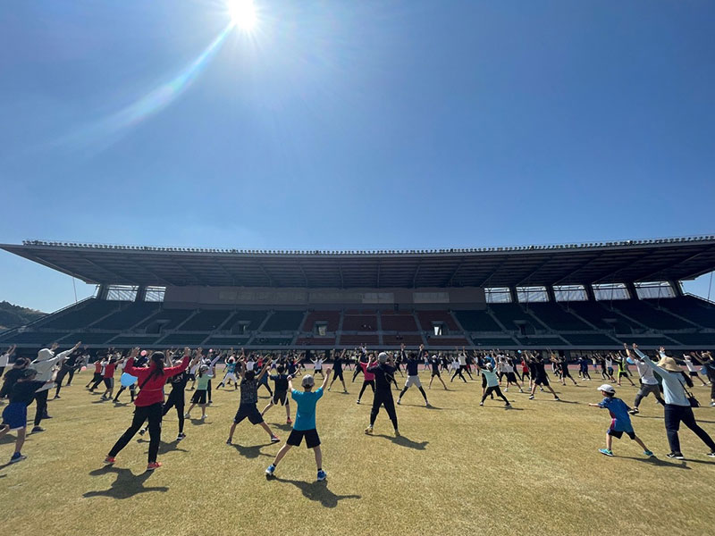 三輪:時間が足りなくて、どうしても「走る」に寄ってしまうという側面はあるのですが、「ただ走る」ではなく、遊びに近い運動を進めていくなかで、頭と身体を連動させて、全身を使って動いていけるようにして、最後に走りへつなげていくことを意識しています。500人が参加して行われた1回目のときは、ウォーミングアップとして、競技場の真ん中に朝礼台を置いて、そこで私がエアロビクスを行いました。なかなかに壮観な光景でした。