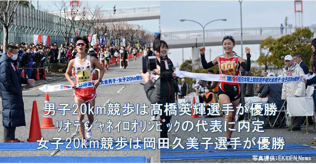 2回の警告が出た松永が16㎞あたりでペースダウンを余儀なくされたことで、優勝争いは髙橋と藤澤の2人に絞られたが、16㎞から17㎞の1㎞でレースが動いた。一時は4分台に落ちていたラップを髙橋が3分52秒に引き上げて藤澤を突き放すと、そのまま逃げ切って1時間18分26秒でフィニッシュ。昨年のこの大会でマークした自己記録(1時間18分03秒=当時日本新)の更新はならなかったが、オリンピック内定を手に入れた。2位の藤澤も最後までよく粘り、初めて1時間18分台に突入する1時間18分45秒でフィニッシュした。続いて3位に食い込んだのは50㎞で代表入りを目指す荒井広宙(自衛隊体育学校、北京世界選手権50km競歩4位)。自身初の1時間20分切りとなる1時間19分54秒の自己新をマークし、20kmでの派遣設定記録も突破した。
